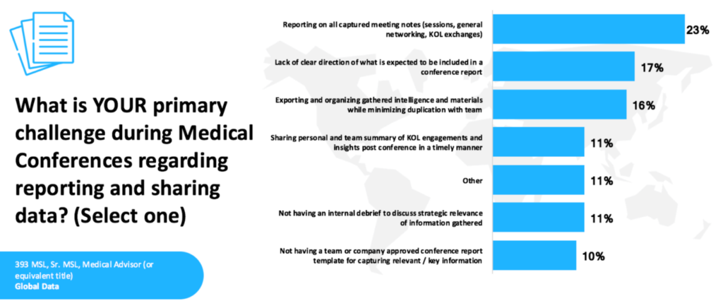 Yet many MSL teams find this step surprisingly difficult. A recent survey of MSL professionals highlights several common challenges in the reporting process. As shown in the figure below, the most frequently cited issue was the difficulty of reporting on all captured meeting notes (23%). Other common challenges included a lack of clear direction regarding what should be included in a conference report (17%), as well as the complexity of exporting and organizing gathered intelligence while minimizing duplication across a team (16%).