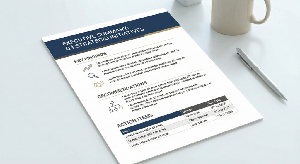 The strongest summaries do not stop at interpretation. They include clear, actionable recommendations tied to ownership and timing.